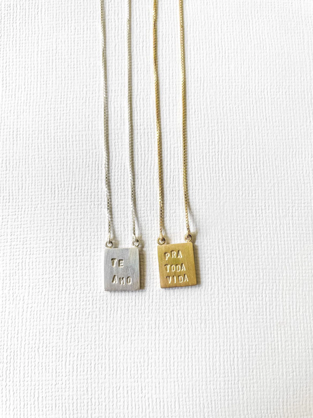 Colar em Prata 950 ou prata 950 com banho de ouro amarelo, com três opções de frase: te amo | pra toda vida | nós dois.